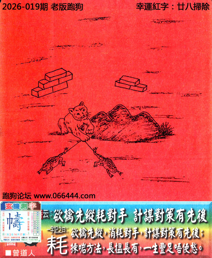 019期老版跑狗一字記之曰:【耗】 欲擒先縱耗對手,計謀對策有先後。 欲擒先縱,消耗對手,計謀對策有先後; 揀啱方法,長搵長有,一生豐足唔使愁。 玄機測字:《幬》