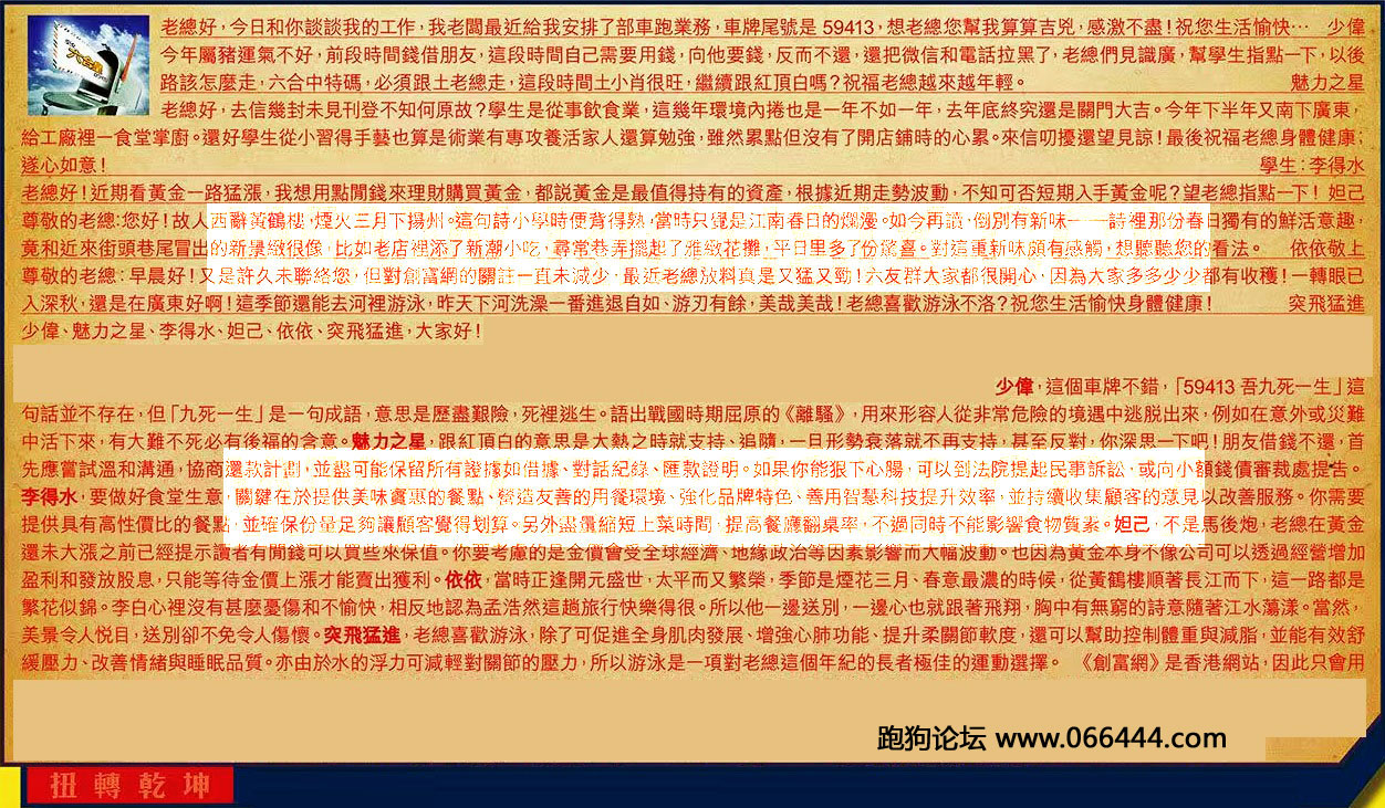 【1】.老總好,今日和你談談我的工作,我老闆最近給我安排了部車跑業務,車牌尾號是59413,想老總您幫我算算吉兕,感激不盡!祝您生活愉快...