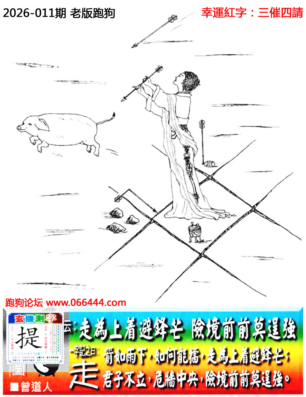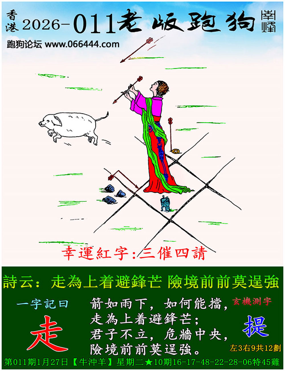 011期老版跑狗一字記之曰:【走】 詩雲:走為上着避鋒芒,險境前前莫逞強。 箭如雨下,如何能擋,走為上着避鋒芒; 君子不立,危牆中央,險境前前莫逞強。 玄機測字:《提》